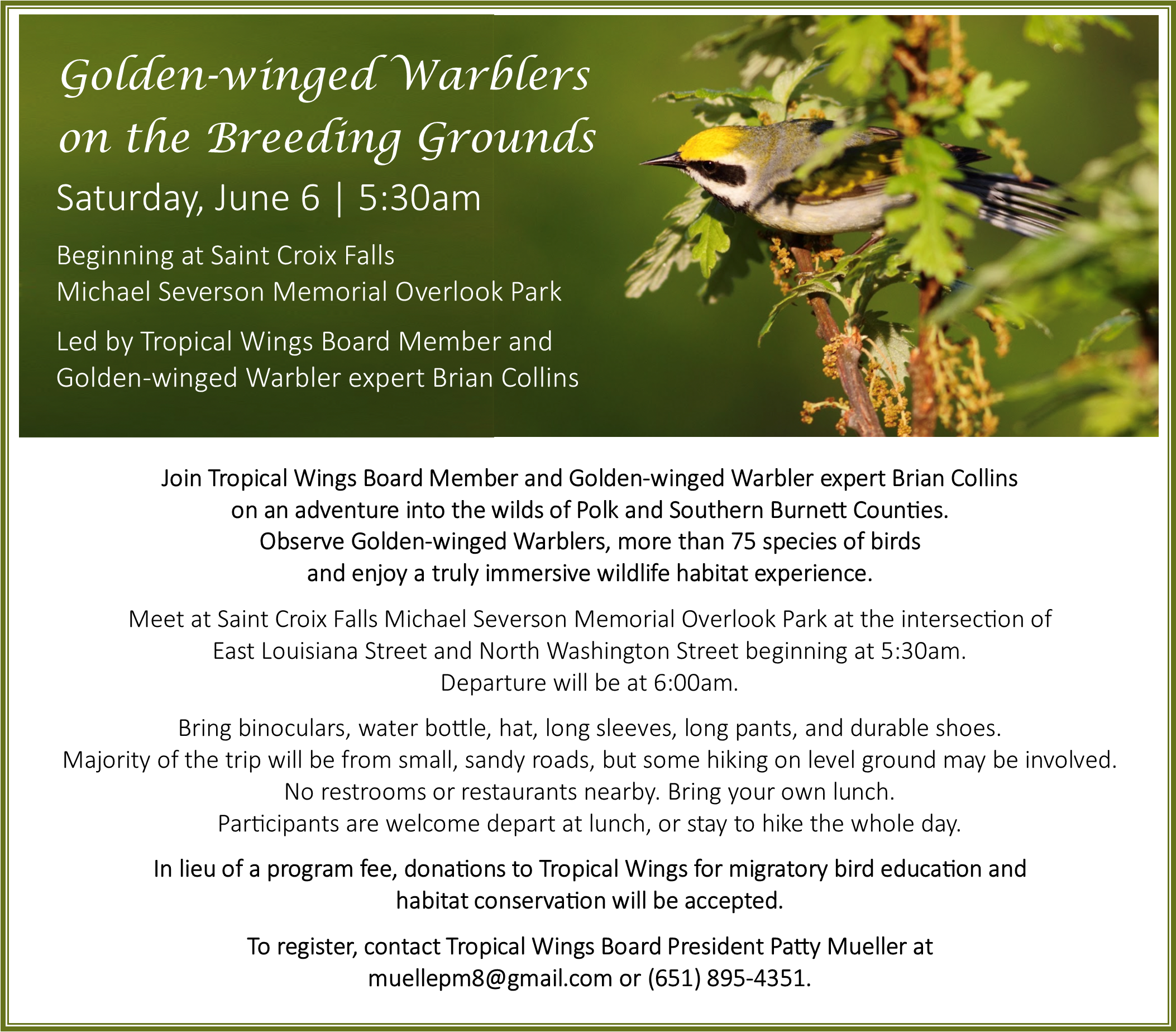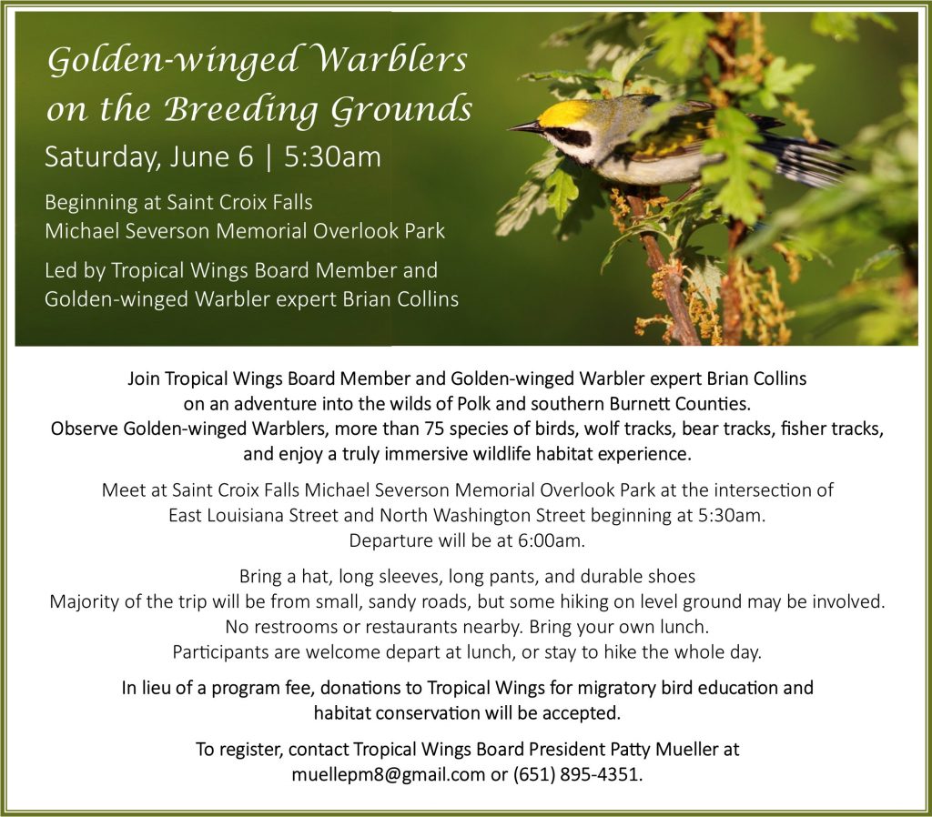 Tropical Wings Inc. is a non-profit 501c3 organization with the mission of promoting an awareness of Neotropical migratory birds and supporting habitat conservation through building relationships within and between communities at both ends of the migration.